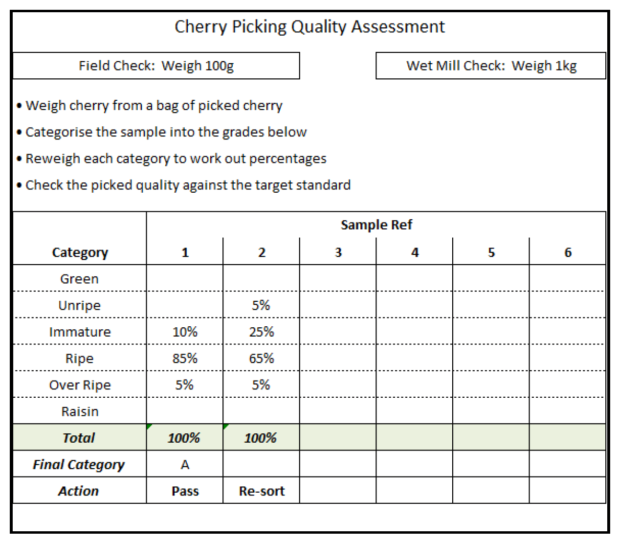 This is a very effective method of maintaining picking quality in the field when used with portable hand scales. Individual organisations can set their own quality standards within these categories. An example form with two completed examples can be seen below