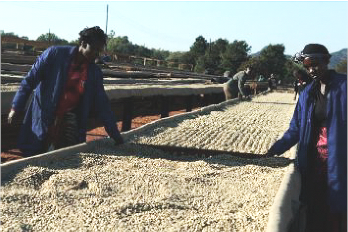 The risk of fermentation is critical in the natural process. A period of three to four days stable dry weather is required for the natural process because extended drying times as a result of wet or humid conditions can increase the risk of fermentation. Covered green-house driers can also be used if weather patterns do not fit the ideal. Design of this type of drier should facilitate low humidity to prevent spoilage and prevent temperatures rising above 35°C for optimum quality59.