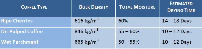 Drying capacity management at the wet mill facilitates effective process flow. Bulk densities, total moisture content, and drying time range for processed coffees prior to drying are as follows