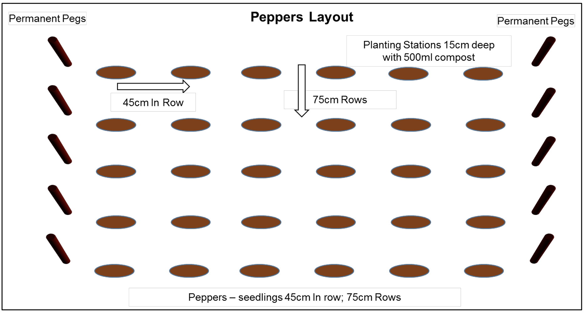 Peppers are planted at a higher population density than eggplant. Plant peppers with 45cm between seedlings and 75cm between rows, similar to cabbages. Pepper plants are vulnerable to lodging towards the end of the growing season, therefore it is advisable to build a trellis network on the row lines for the plants to gain support.