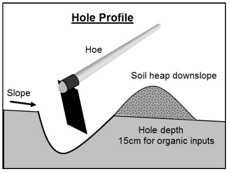Place the measuring rope on the permanent pegs, lift and drop it several times to make sure it is straight and tight. Looking up the slope, line up the centre of the hoe head with the measuring rope marker. Start digging 15cm away from the marker gradually going deeper and deeper as you come closer and closer to the marker on the rope. This usually takes about 5-6 strikes and is a large amount of soil so ensure that it is placed in a neat heap on the downslope side for refilling of the planting station later. Note how they are steep on the upslope side and shallower on the downslope side.